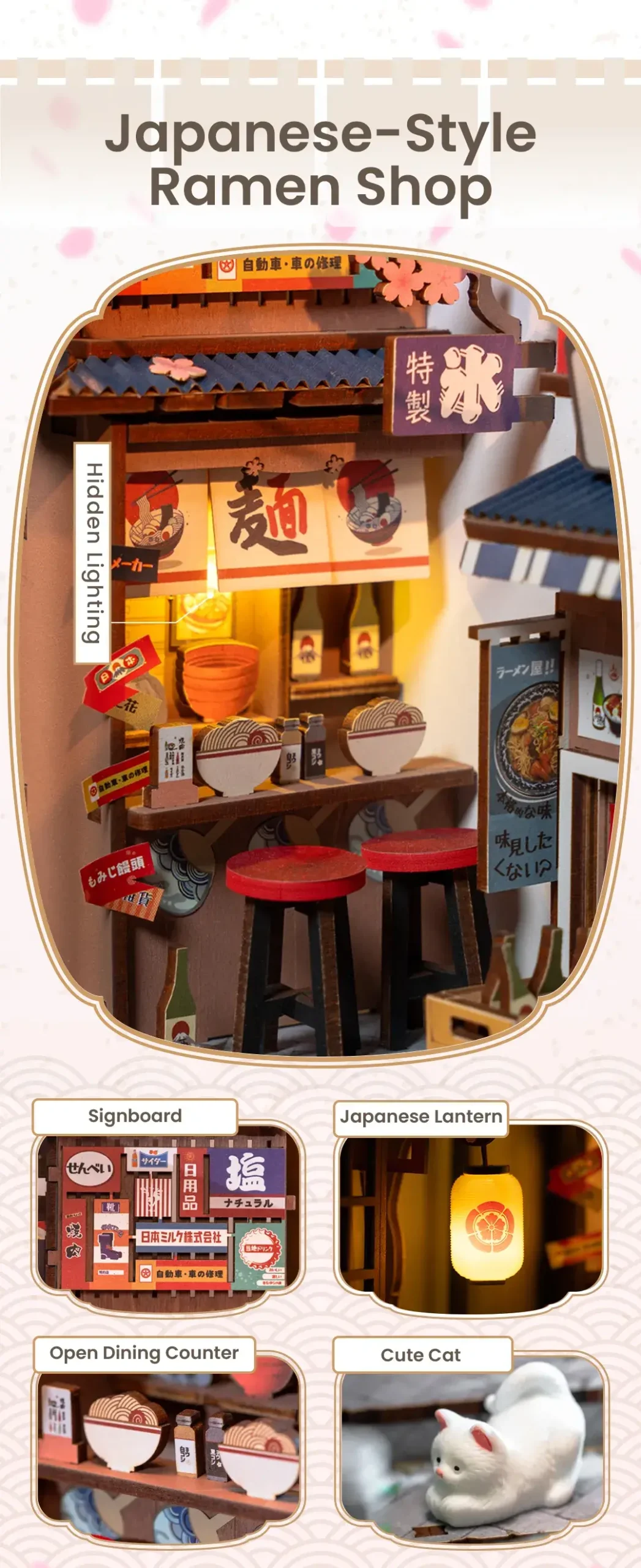 Modelul Aleea Japoneză Sakura TGB11 de la Rolife este o dioramă pentru bibliotecă sau o căsuță în miniatură 3D care îți oferă posibilitatea de a-ți construi propria scenă printre cărți, piesă cu piesă. În pachet vei gasi tot ce ai nevoie pentru a construi o frumoasă stradă plină cu restaurante și detalii adorabile din cultura japoneză.