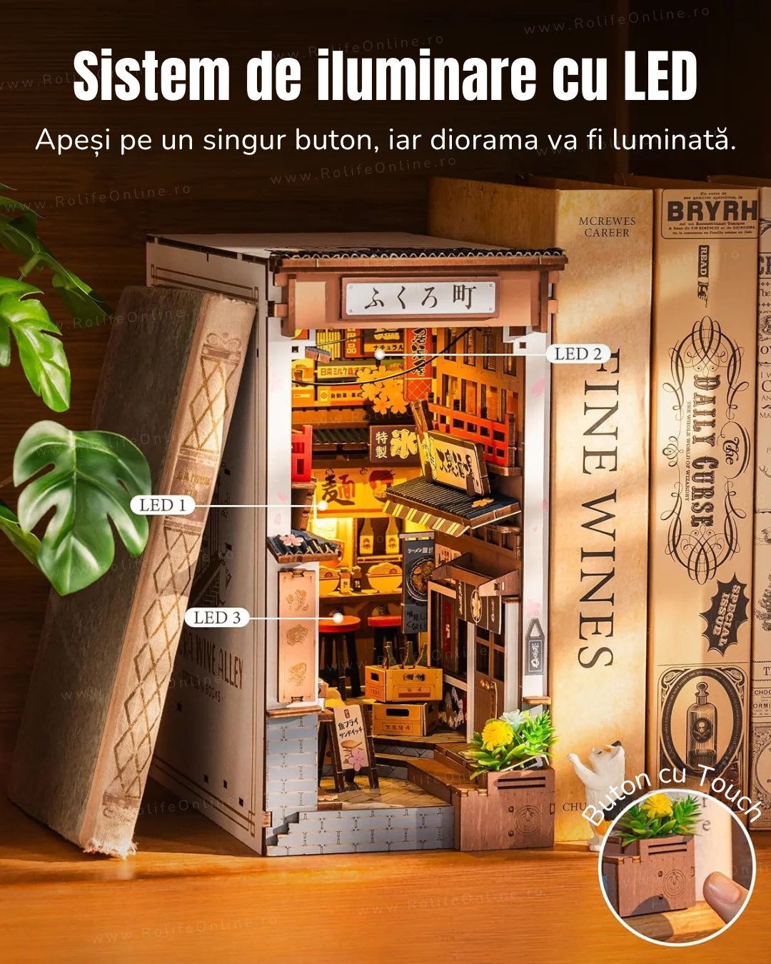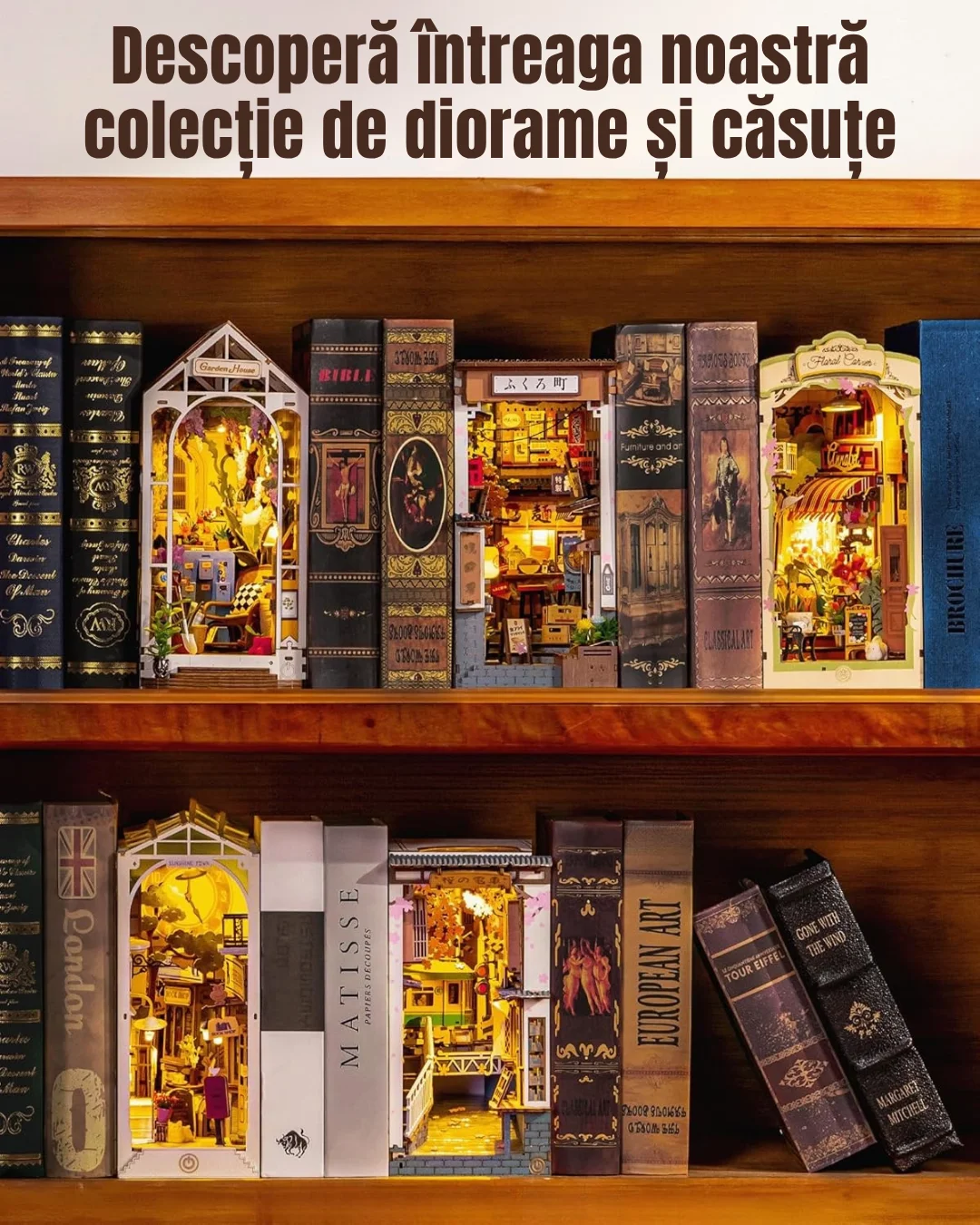 Această dioramă va fi, totodata, un decor unic și rafinat pentru raftul tău de cărți sau pentru biroul tău, mai ales noaptea când lumina caldă luminează întreaga scenă.