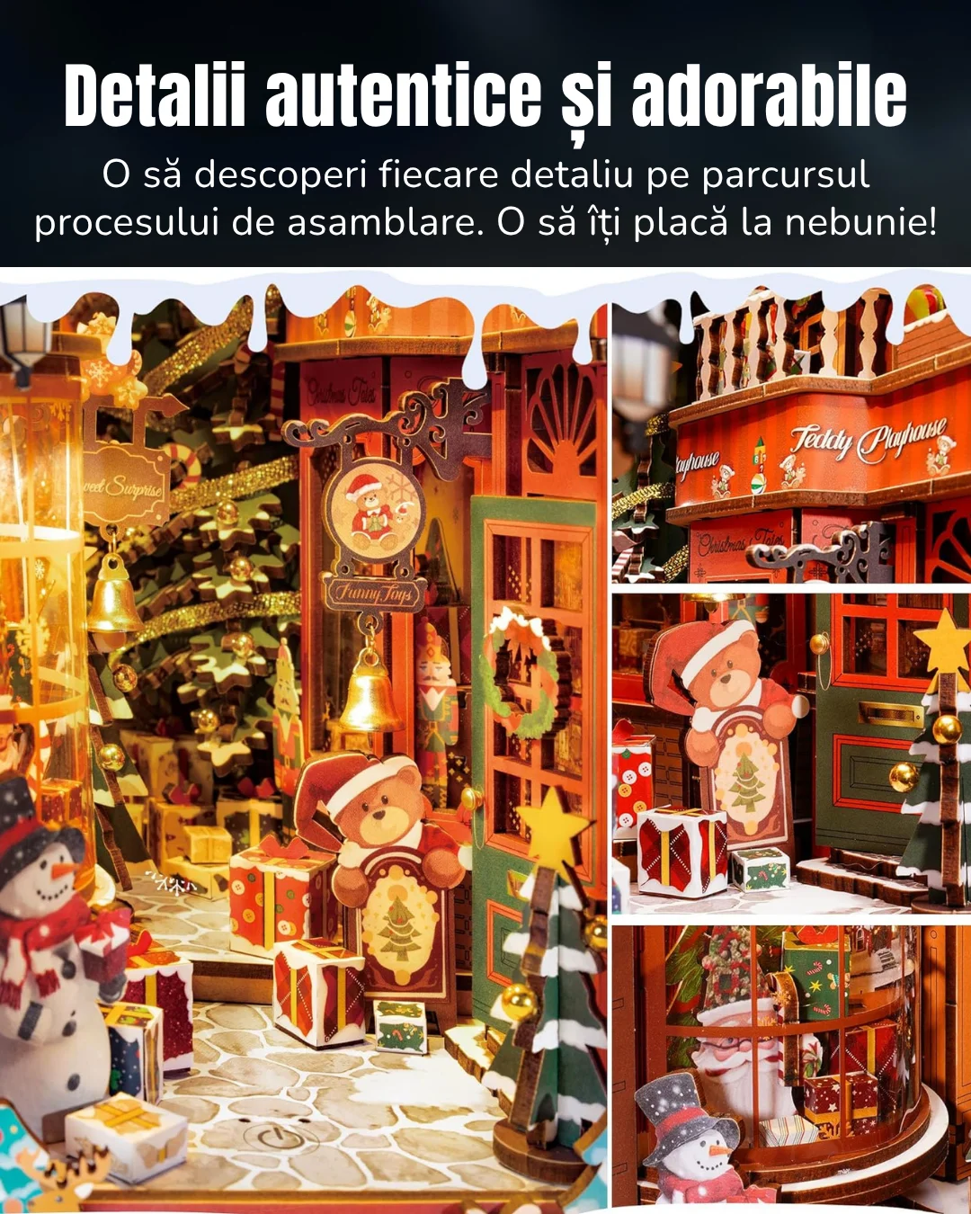 Modelul Magia Crăciunului TGC07 de la Rolife este o dioramă pentru bibliotecă sau o căsuță în miniatură 3D care îți oferă posibilitatea de a-ți construi propria scenă de Crăciun, piesă cu piesă. În pachet vei gasi tot ce ai nevoie pentru a construi o frumoasă scenă de Crăciun cu detalii adorabile.